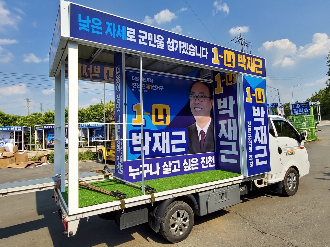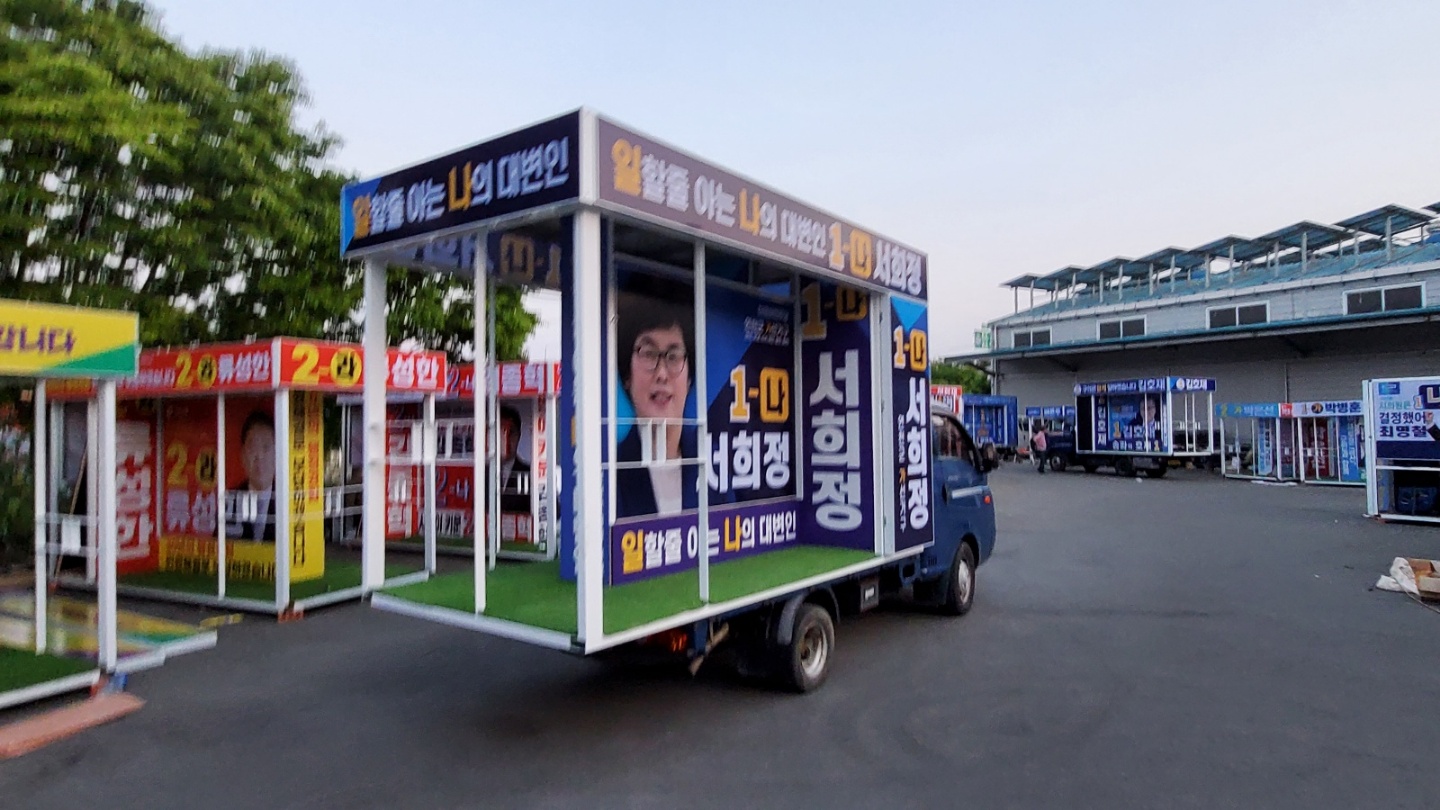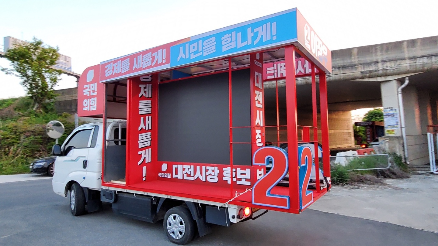 유세 시에는 적재함을 내려 광고면을 넓게 확보해 시인성을 높입니다.